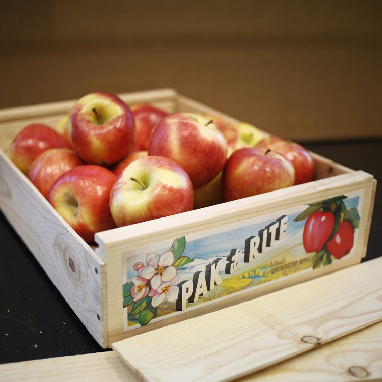 Order a custom packed, half crate (14pc) of fresh, Washington apples. Up to two apple varieties of your choice are sorted, polished, and shipped in our amazing, reclaimed wooden apple crate.